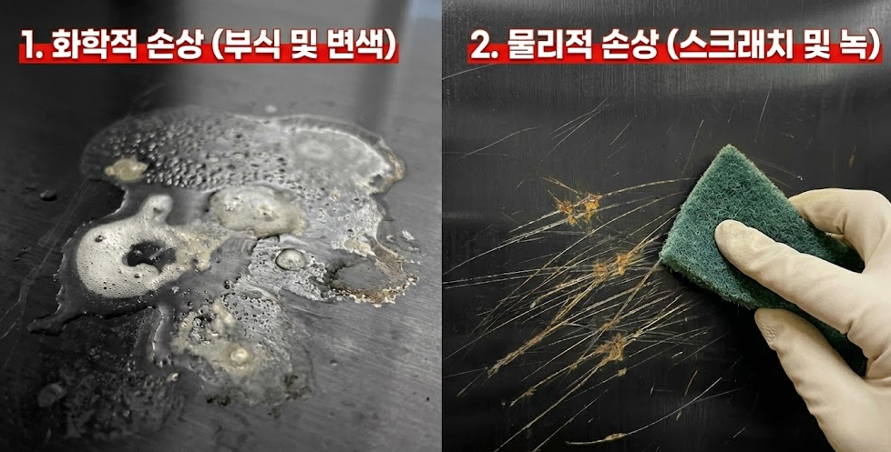 잘못된 청소 방식은 표면 코팅층을 영구적으로 손상시켜 돌이킬 수 없는 얼룩을 남깁니다.